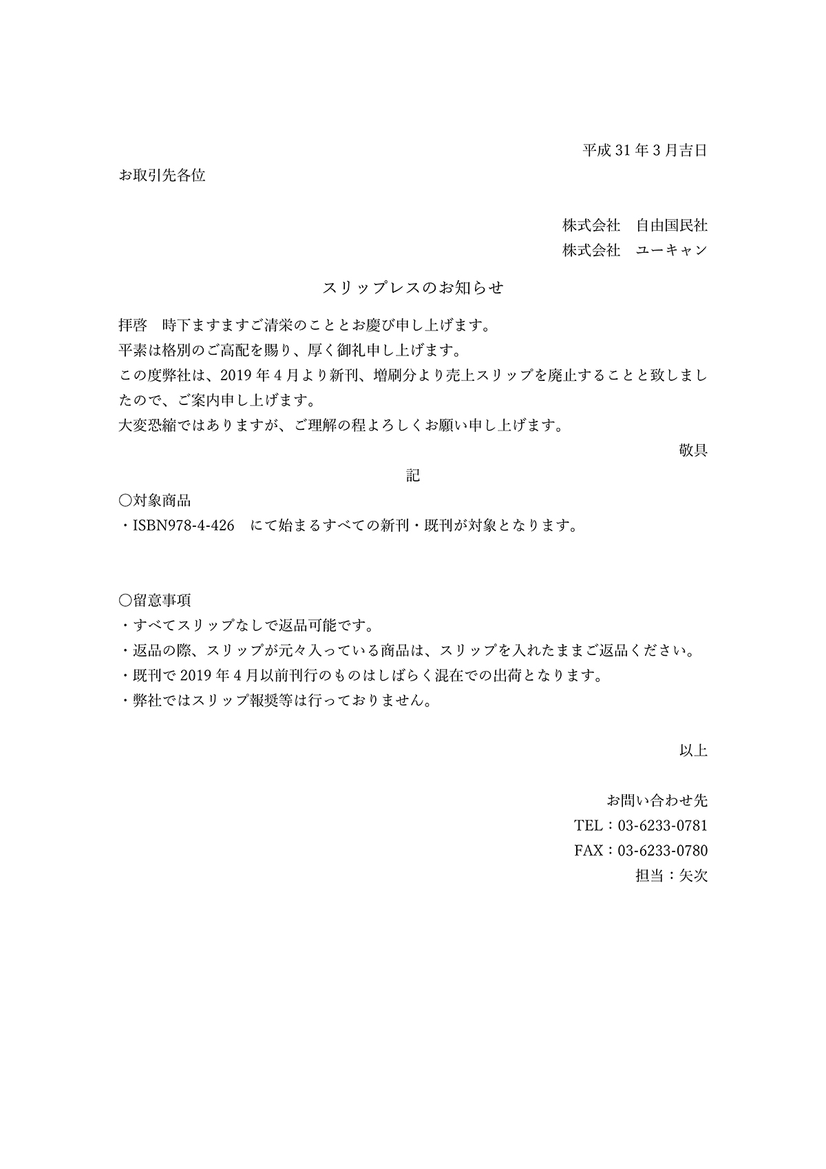 この度弊社は、2019年4月より新刊、増刷分より売上スリップを廃止することと致しましたので、ご案内申し上げます。